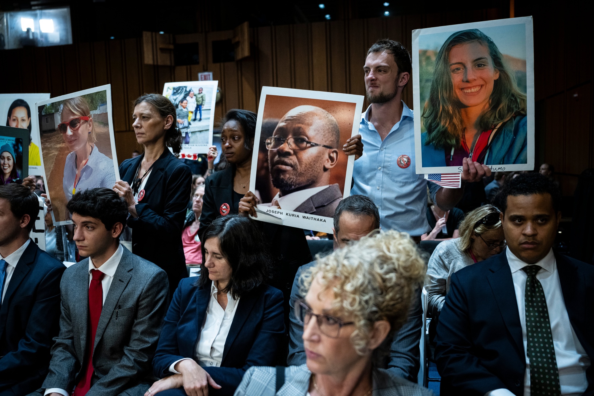 波音公司飞机失事受害者的亲属在6月18日的华盛顿参议院听证会前举着照片。