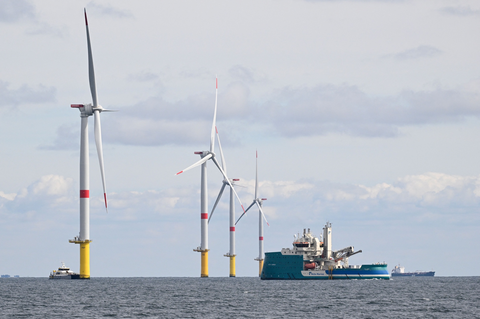 法国拉图尔巴勒海岸外的海上风力发电场的风力涡轮机和电气变电站。