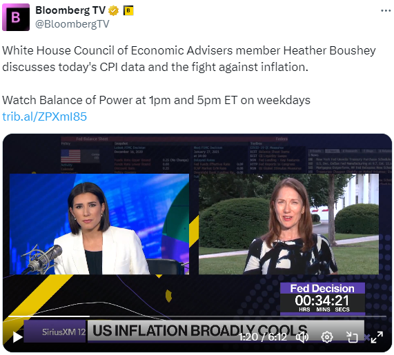 今天在彭博电视台的 权力平衡 早间版节目中,主持人乔·马修和凯莉·莱因兹采访了白宫经济顾问委员会成员希瑟·布谢,谈论了今天的消费者价格指数数据和抗击通货膨胀的斗争。