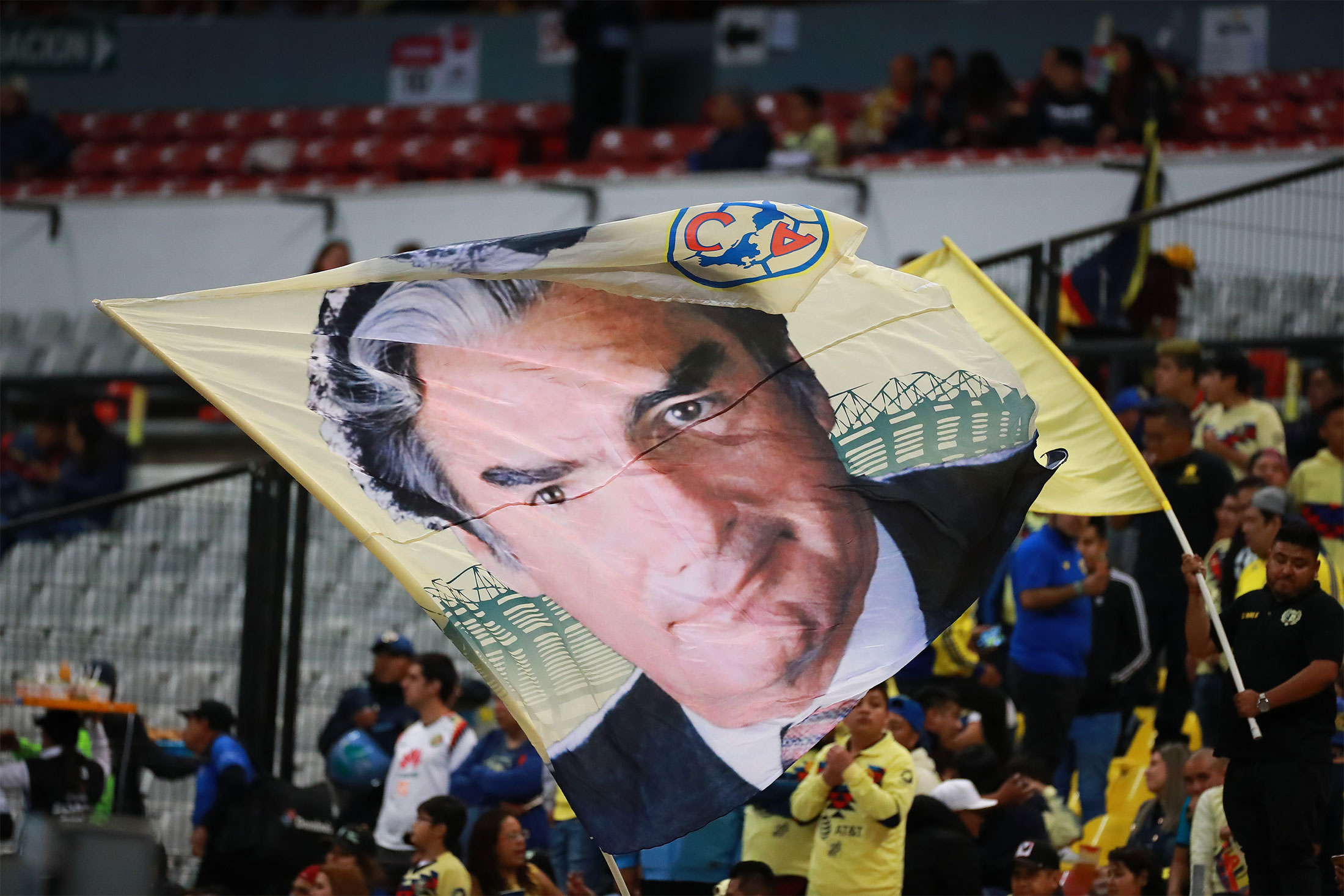 2020年,一名球迷在阿兹特克体育场挥舞着一面印有阿兹卡拉加的父亲、前美洲俱乐部老板埃米利奥·阿兹卡拉加“老虎”照片的旗帜。摄影师:Hector Vivas/Getty Images他委托设计的体育场由著名建筑师佩德罗·拉米雷斯·瓦兹克设计,他的作品包括墨西哥城的其他标志性建筑,如人类学博物馆和国会宫。