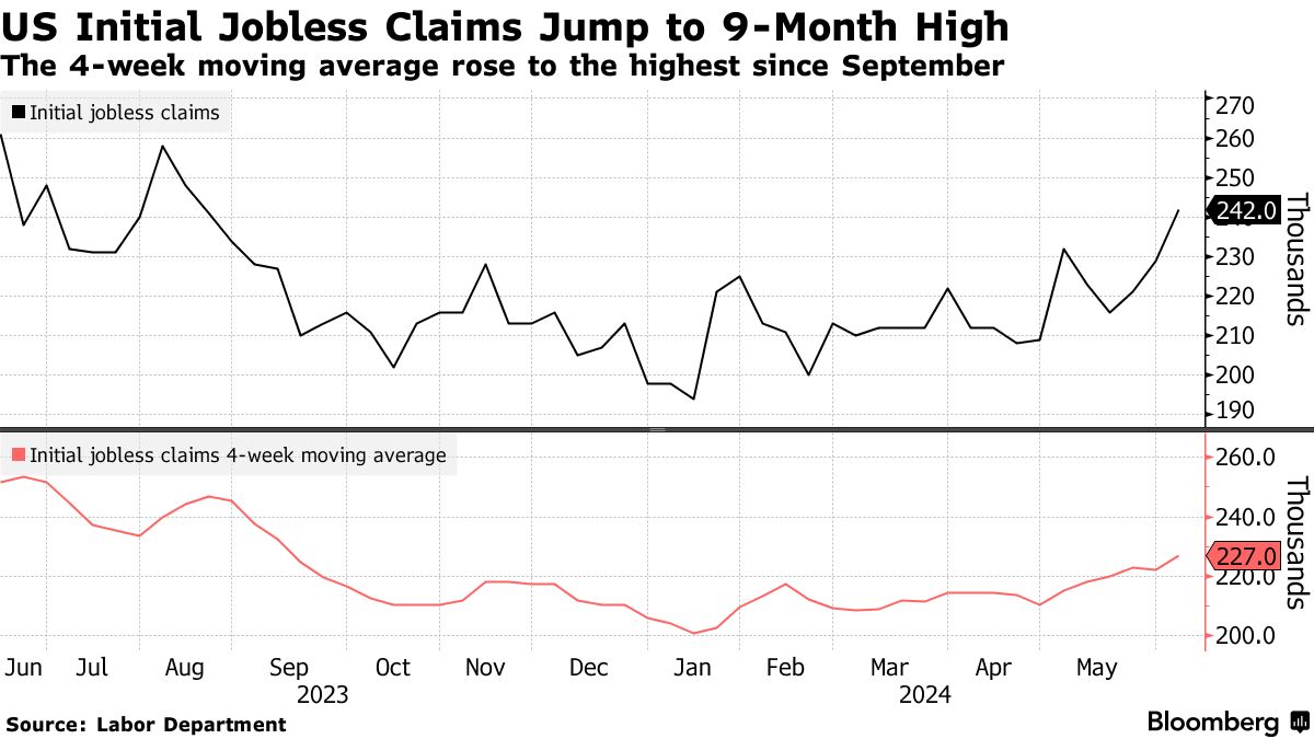 初始申请量在截至6月8日的一周内增加了13,000至242,000,根据周四发布的劳工部数据。这一数字高于经济学家在彭博调查中的所有预测。