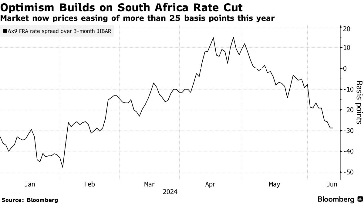 Jacob Zuma在南非约翰内斯堡附近为他的政党uMkhonto we Sizwe(MK)举行媒体简报,时间是6月16日。摄影师:Per-Anders Pettersson/Getty Images交易商将对南非自四年来首次降息的押注提前到了九月,因为这个国家最大的政治对手在上个月的选举中未能产生明显的赢家后,越来越接近组建一个受投资者青睐的政府。