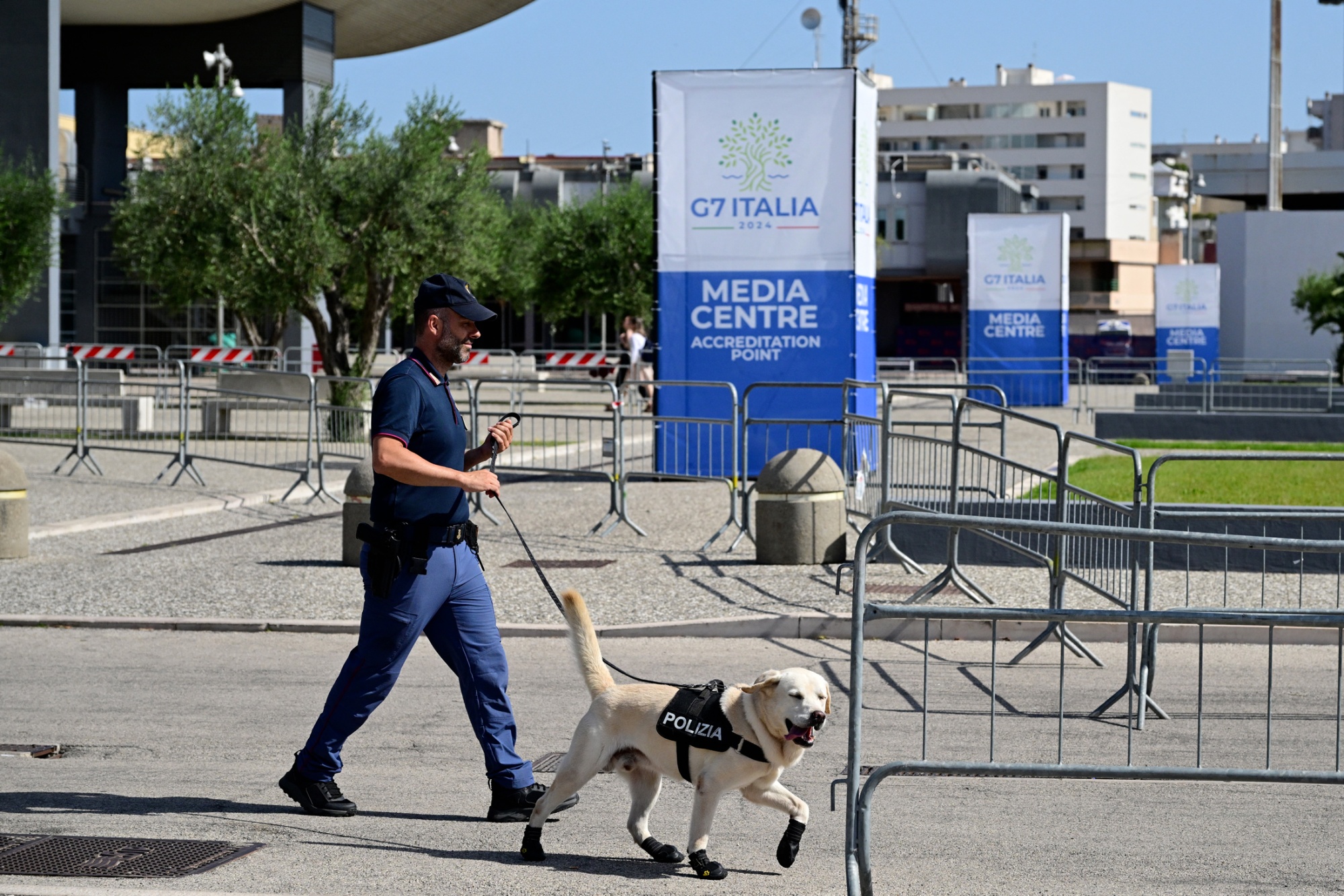 一名警察与一只缉毒犬在G-7峰会的媒体中心附近走动。摄影师:Tiziana Fabi/Getty Images### 全球必读