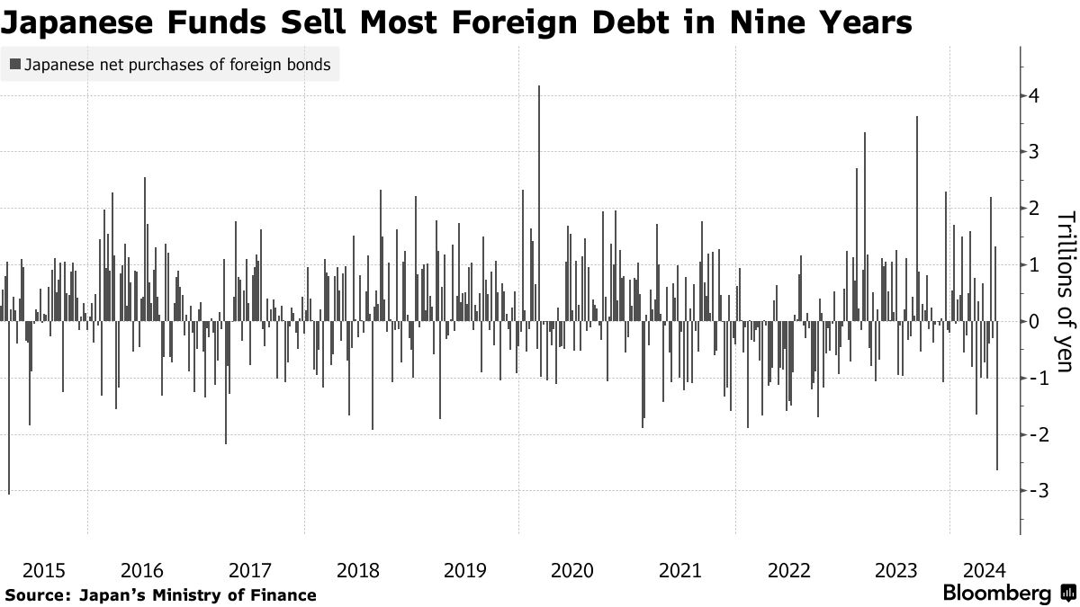 初步的每周数据并未提供出售债券类型等详细信息。渣打银行东京金融市场主管江河福广表示,投资者可能出售了对冲成本高的外国债券,以购买日本政府债券。
