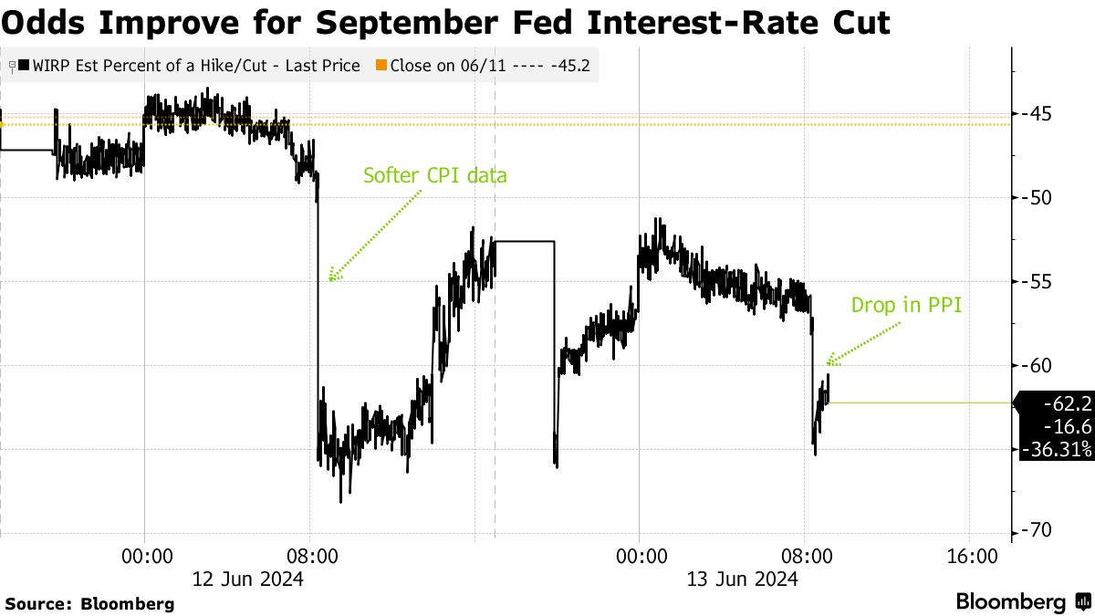 这样的数据将有助于支持今年两次降息的立场,可能从9月份开始,此前美联储在周三发布的更新季度预测中显示,中位数官员预计只会降息一次。在周四的数据发布后,投资者将9月份降息幅度为25%左右,12月份降息的机会为80%左右,根据期货市场。