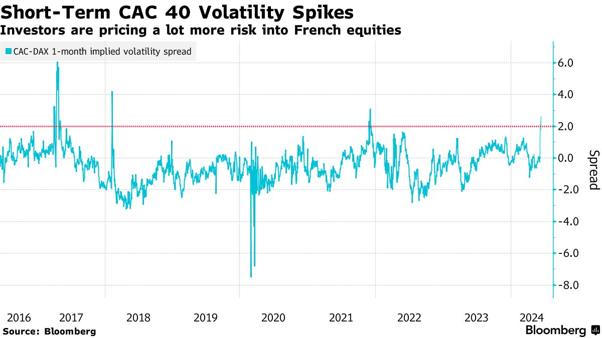 由于突发选举带来的政治动荡,法国有可能失去欧洲最大股市的地位。不到两年前,法国股市超过英国,登上榜首,但投资者本周在马克龙决定后抛售了该国的股票和债券。他们担心如果马克龙的党在选举中失去地盘,公共财政将进一步恶化。