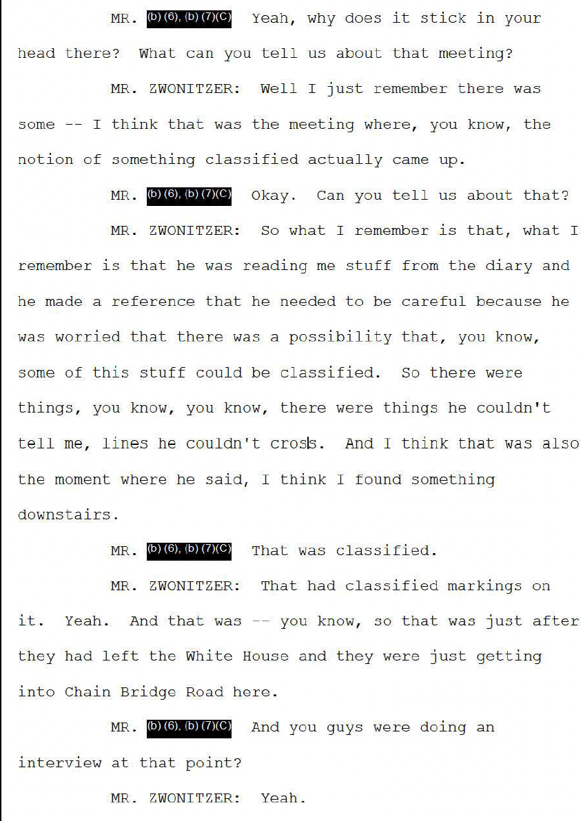 特工和检察官询问 Zwonitzer 关于他为这些书进行研究的方式,并要求他谈谈拜登或他的工作人员在他去白宫采访当时的副总统时与他分享的任何笔记、日记或日记。Zwonitzer 说拜登确实与他分享了某些记录,但“从未让日记离开他的手”。Zwonitzer 表示,有一次,他说如果拜登允许他复印这些页面,那将会更“高效”。拜登“礼貌但坚决地”拒绝了这个提议。