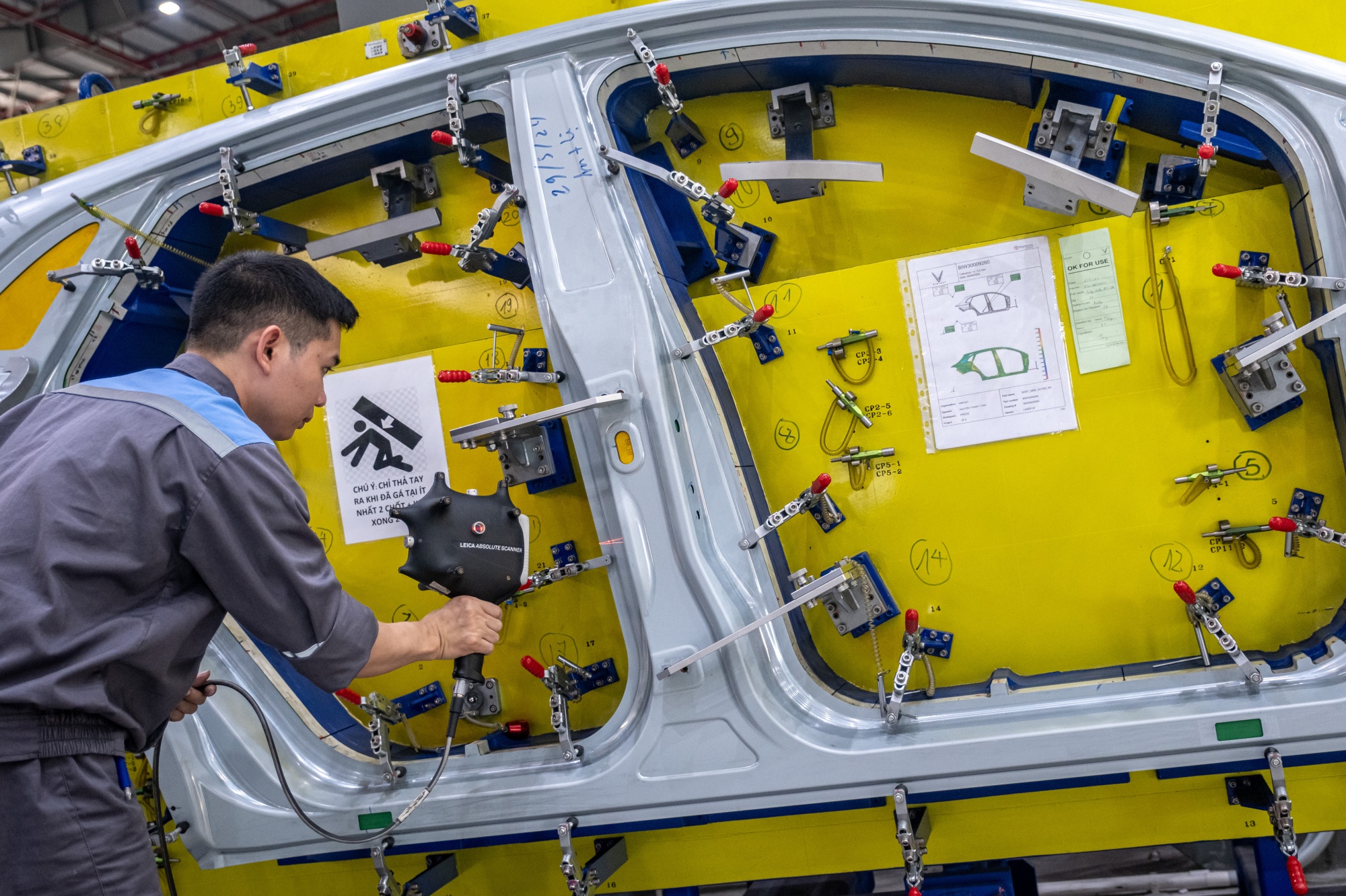 一名工人正在为电动汽车车身侧板进行质量检查。摄影师:Linh Pham/Bloomberg坐在一幅描绘神秘山脉的落地壁画前接受罕见采访,穿着蓝色西装和红色领带的阮先生似乎对面临的挑战毫不畏惧。