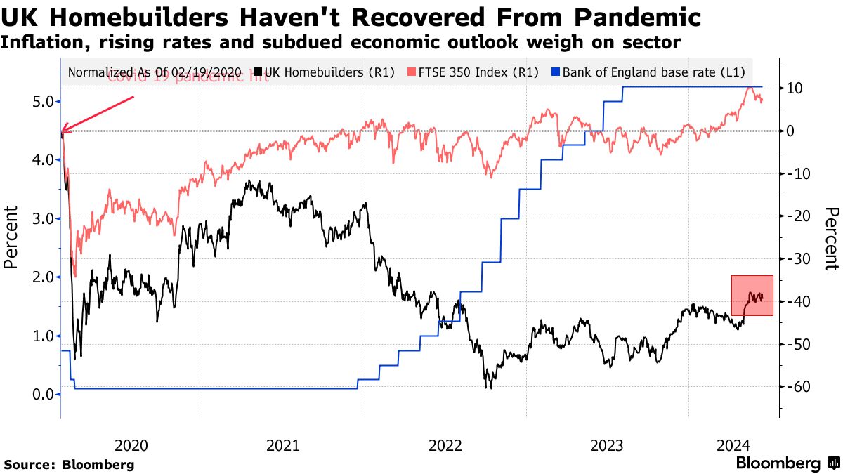 自2023年底大幅反弹以来,英国房地产行业自年初以来一直与富时350指数表现一致,上涨约6%。尽管受到高利率下需求不足的影响,但该国长期存在住房短缺问题,上行空间受到限制。