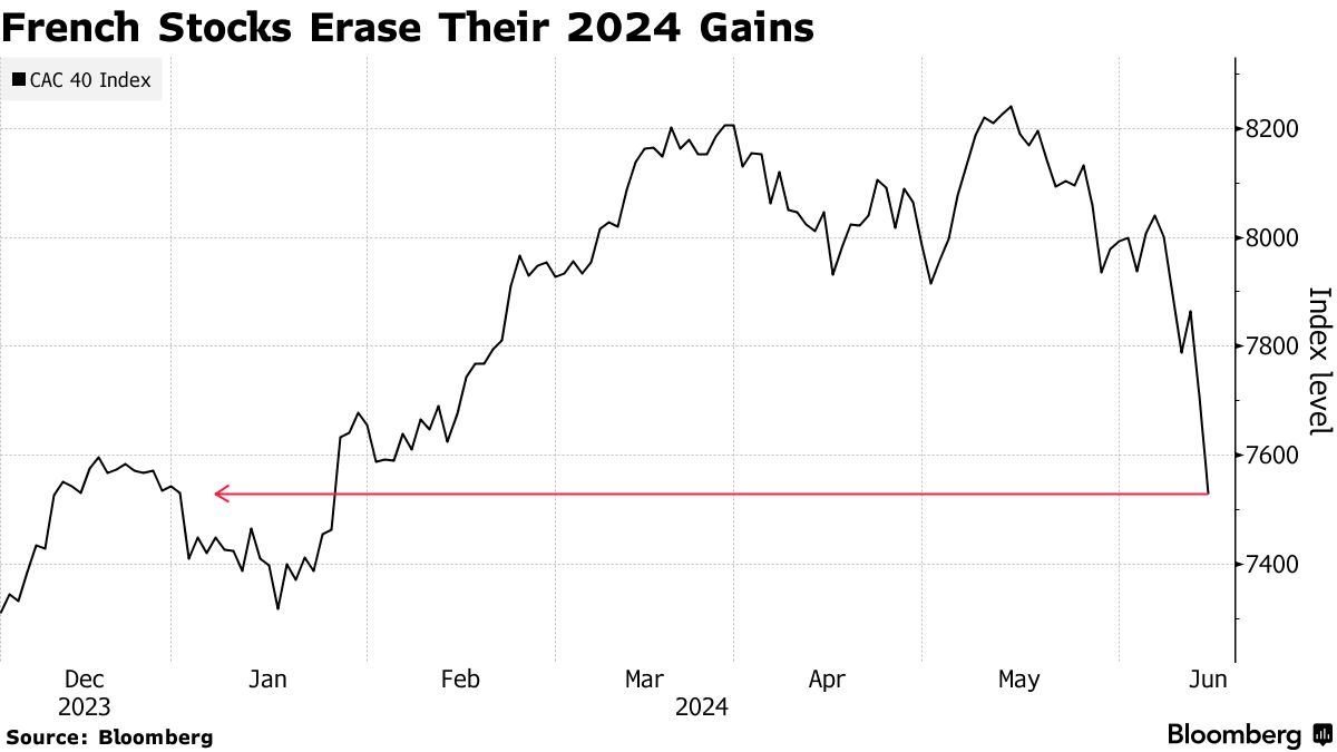 法国CAC 40指数本周下跌近6%,将迎来自2022年3月以来最大的周跌幅,并放弃了截至目前的年度涨幅。这一暴跌让法国有失去欧洲最大股票市场的风险。
