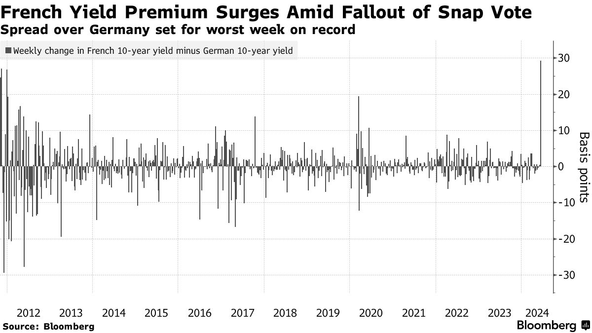 政治上的不确定性以及下一届政府越来越有可能推行对公共财政造成成本高昂的措施已经让投资者感到恐慌。上周五,法国债券连续第五天表现不佳,与更安全的德国同行相比,10年期利差扩大至79个基点,创下自2017年以来的最高纪录。