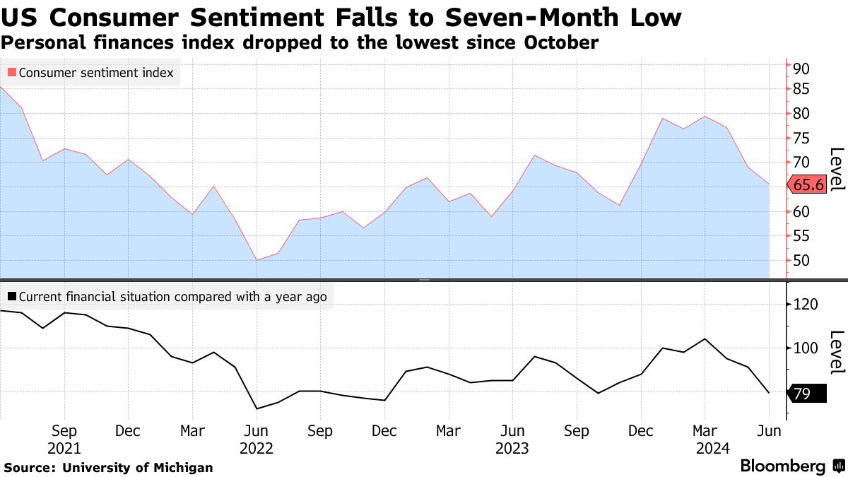 消费者对个人财务状况的当前评估指数下降了12点至79,是自去年十月以来最低,也反映了对收入的担忧。对经济状况的看法降至自2022年底以来的最弱。