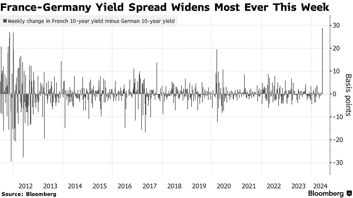 交易员纷纷减少风险,本周法国股市价值大约蒸发了$2100亿 — 相当于希腊经济规模 — 在总统埃马纽埃尔·马克龙宣布举行提前选举后。法国债券成为市场动荡的焦点,本周法国10年期债券溢价比德国同行飙升到创纪录水平。