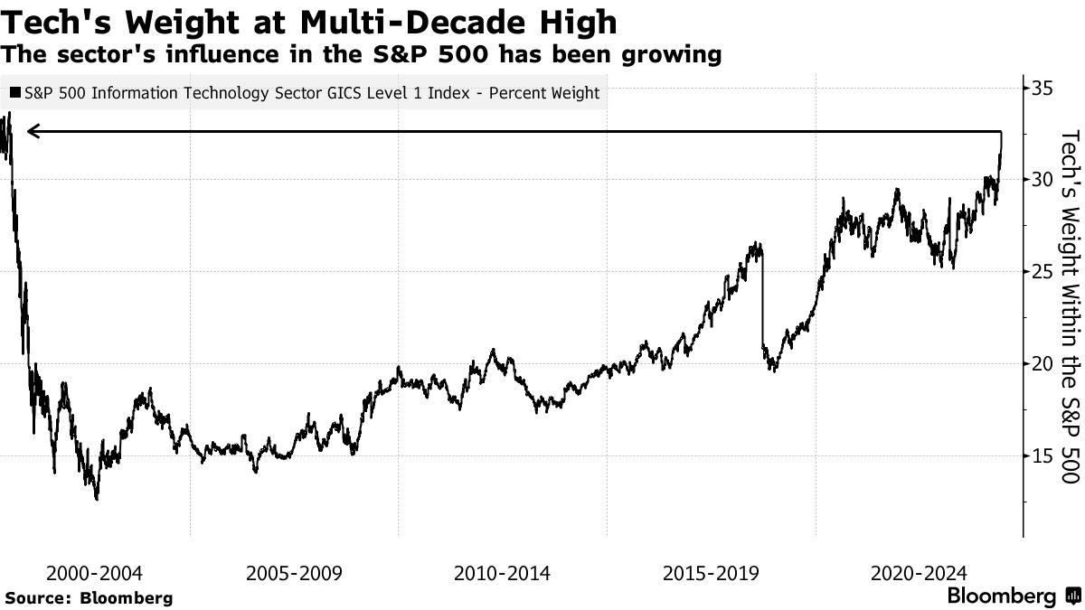 苹果、微软和英伟达的巨大规模是科技在股票指数中变得如此主导的关键原因。标普500指数的科技部门占整体基准指数的32.6%。这是自2000年以来,即互联网泡沫时代以来的最高比例,比4月份不到29%的最近低点高出很多。这三家市值达到3万亿美元的公司共占标普500指数的约21%。