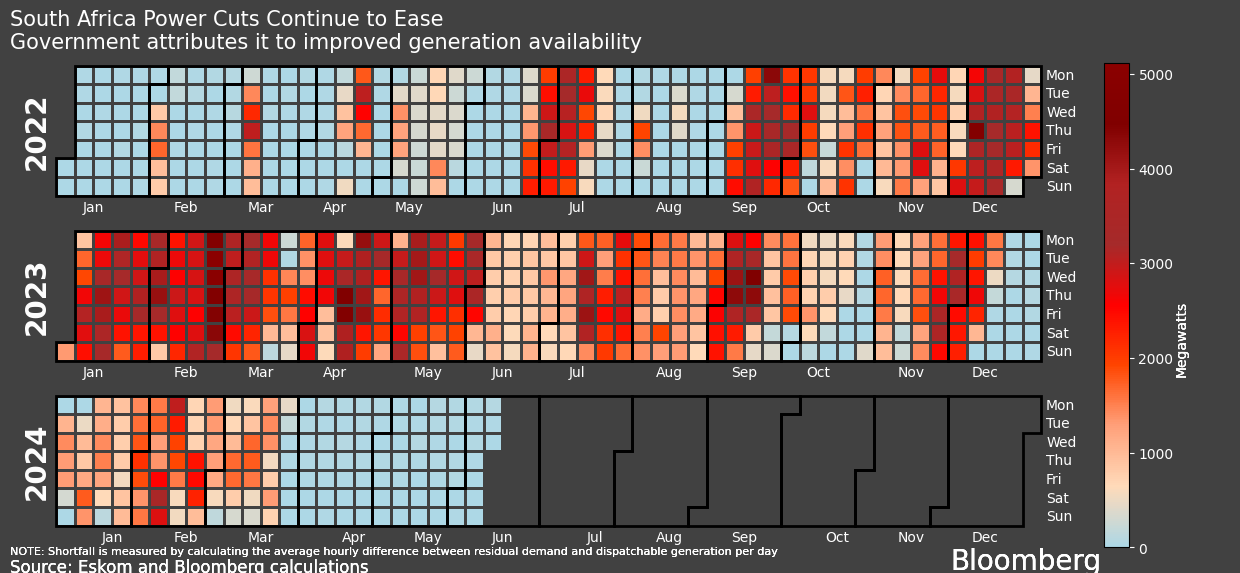 来源:彭博社埃斯康姆的能源可用性因子,即其主要以燃煤为主的电厂的性能指标,由于故障而下降到一半以下后正在改善。最新战略旨在到2025年3月实现70%的可用性。预计将有约2500兆瓦的燃煤和核电机组容量重新上线以增加供应。
