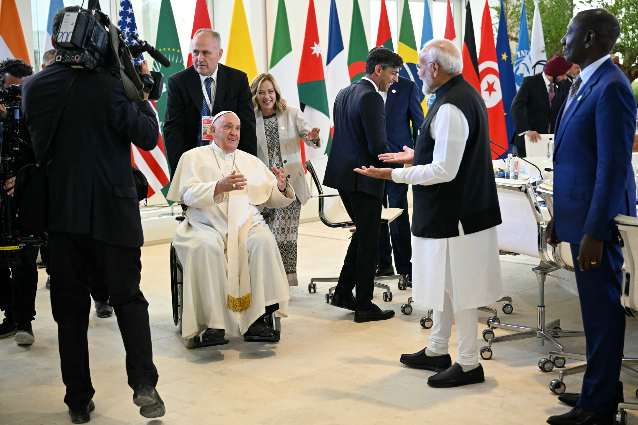 教皇方济各首次参加七国集团峰会,乘坐一架白色直升机降落,并滚入一个由世界领导人组成的房间,发出警告称人工智能“既迷人又可怕”。