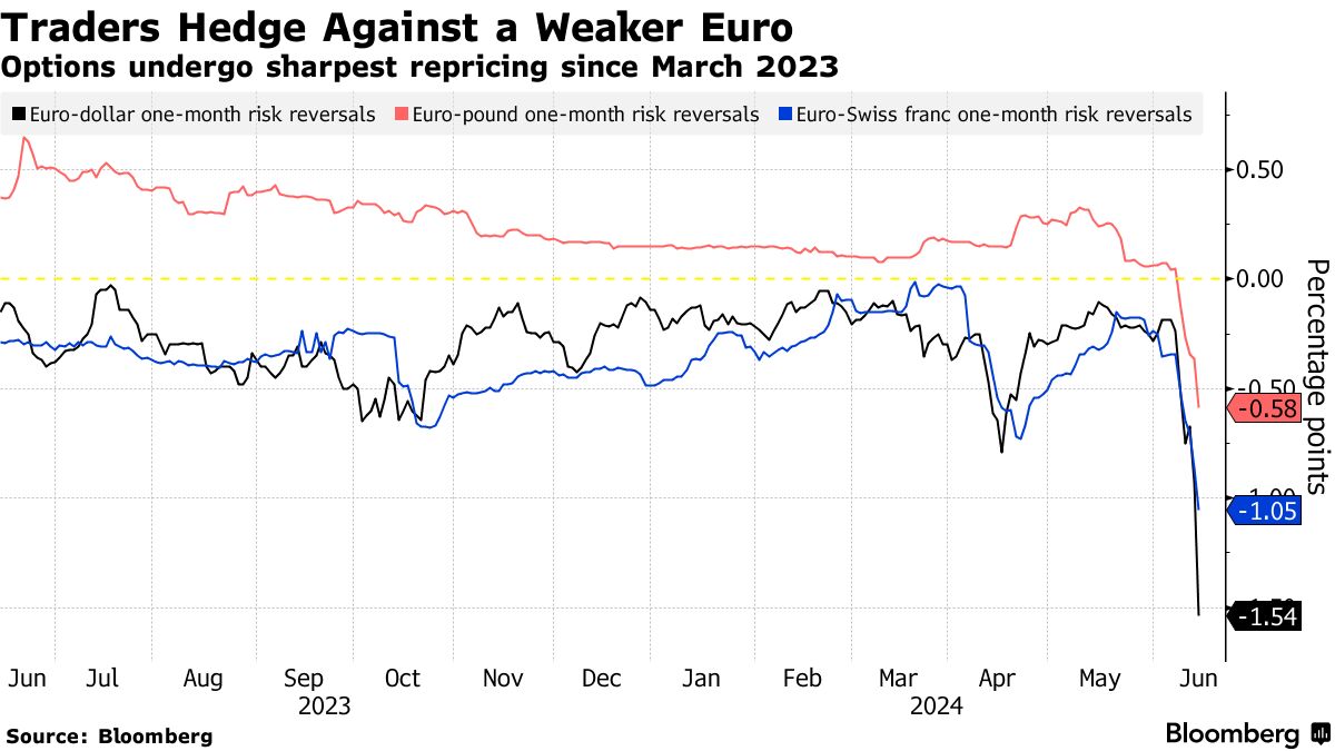 欧元兑美元跌至1.07美元,创下六周低点,而下个月的波动率指标激增,表明交易员们认为在投票前存在不稳定交易的风险。法国财政部长布鲁诺·勒梅尔警告称,如果法国新左翼联盟上台,将导致该国退出欧盟。