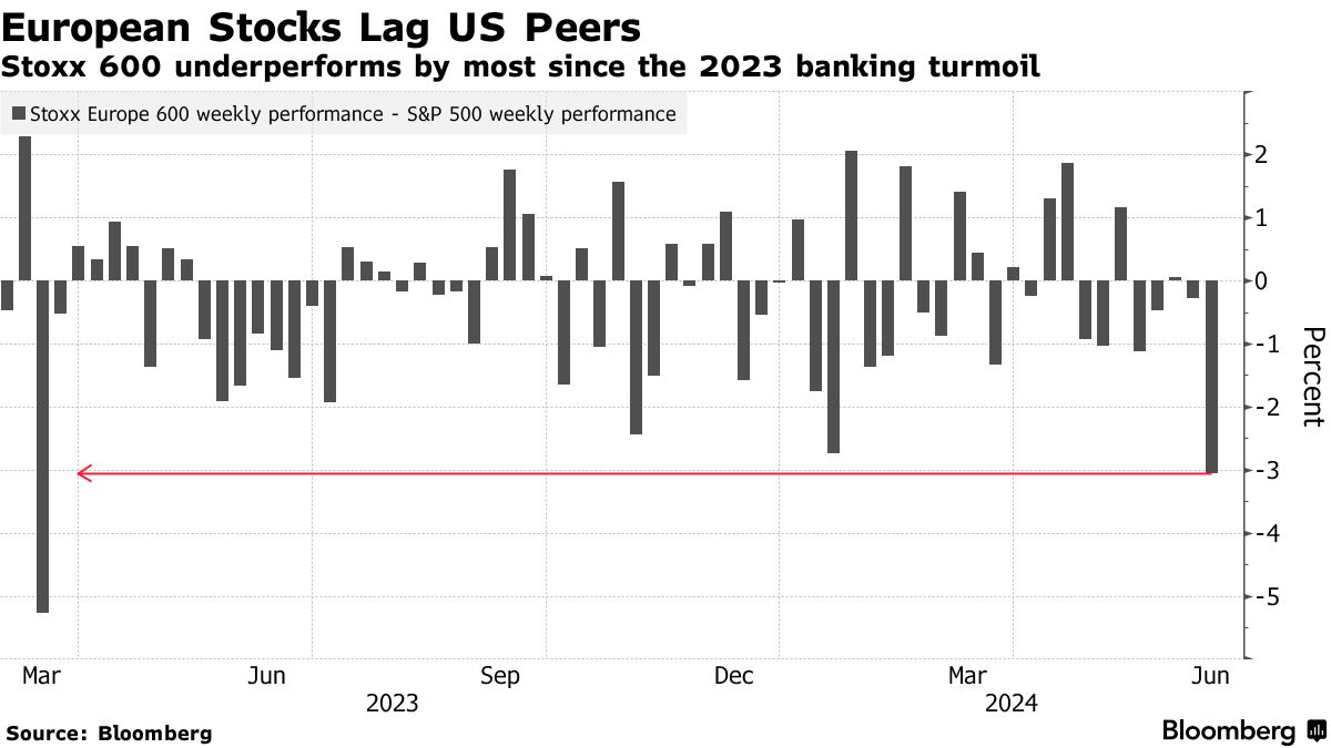 投资者对马克龙的中间派、亲商业的复兴党在6月30日和7月7日的两轮投票中进一步失去地位的前景感到退缩。这可能导致总统任命来自玛琳·勒庞的极右翼国民集会党或左翼联盟的总理。马克龙表示,无论选举结果如何,他都不会辞职。