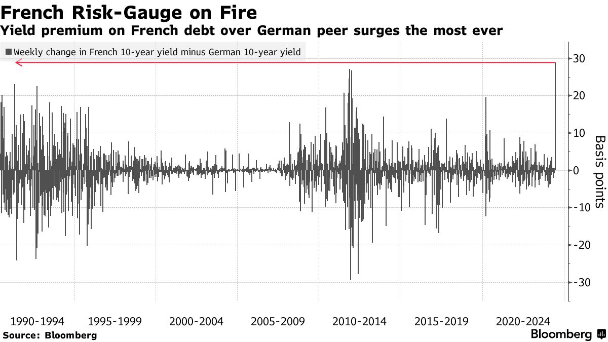 政府债券是暴跌的核心,投资者要求持有10年期法国国债比德国国债的溢价创下有史以来最大的周涨幅。抛售行为使法国股票价值蒸发约2100亿美元,法国银行Société Générale SA、BNP Paribas SA和Crédit Agricole SA — 所有这些银行都是政府债券的大持有者 — 每家损失超过10%。