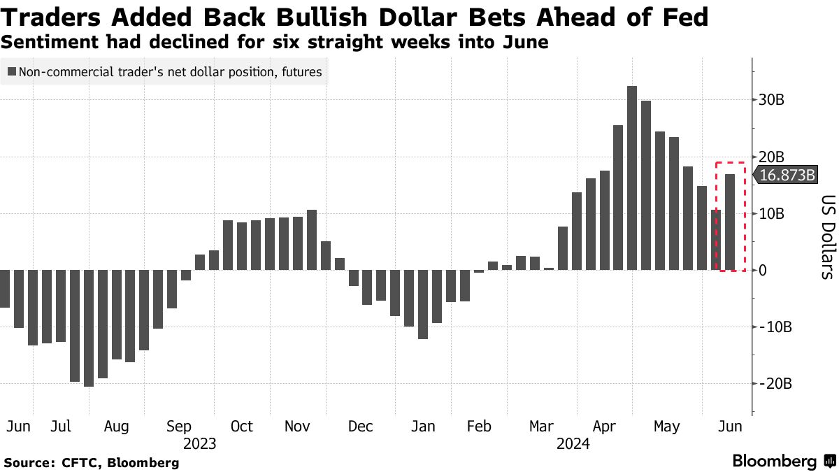 这对于在截至6月11日的一周内大量购买将受益于美元走强的合约的投机交易员来说是一个受欢迎的发展。根据彭博社汇编的商品期货交易委员会数据,他们在5月大部分时间内减少了对美元看涨的押注,但在6月11日前的一周内又增加了超过60亿美元的美元看涨押注,这是自4月底以来情绪最大的飙升。