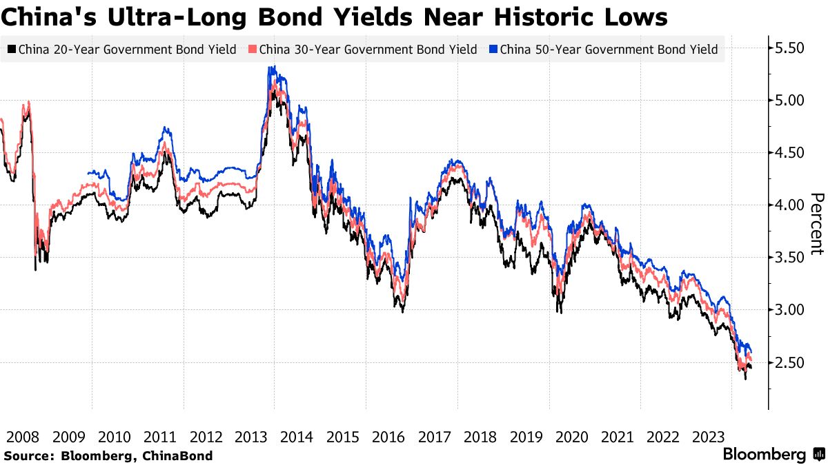 据交易员称,中国以2.53%的收益率出售了350亿元人民币(48亿美元)的50年期特别国债。这一收益率低于彭博调查中2.58%的估计。据这些交易员透露,这笔债券的需求超过了发行量的五倍以上,但由于信息属于私密信息,他们要求不透露身份。