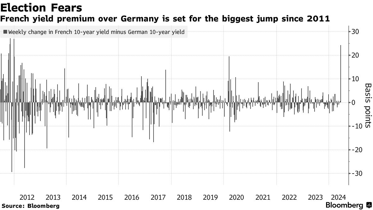 在本周巴黎的政治动荡中,法国和德国10年期债券收益率之间的利差扩大了7个基点,至68个基点,这是自2017年以来的最高水平。