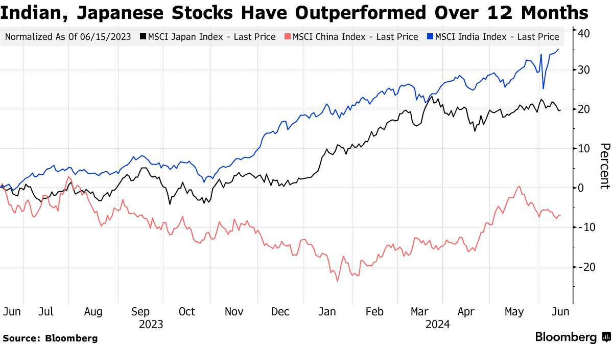 在本季度,在香港上市的中国股票指数上涨了超过10%,而印度的NSE Nifty 50 指数上涨了4.8%。相比之下,自4月初以来,Topix指数下跌了1.3%。