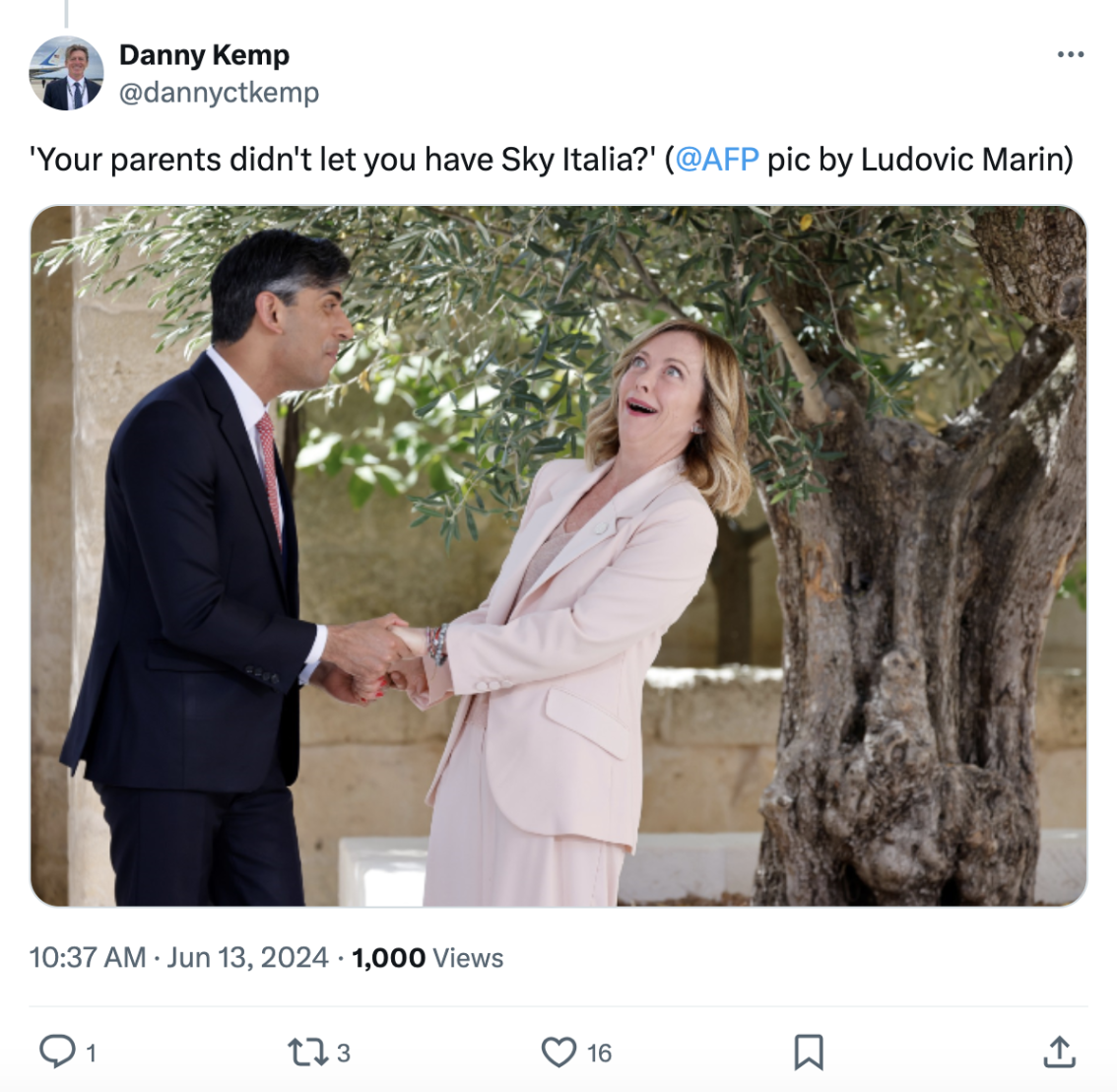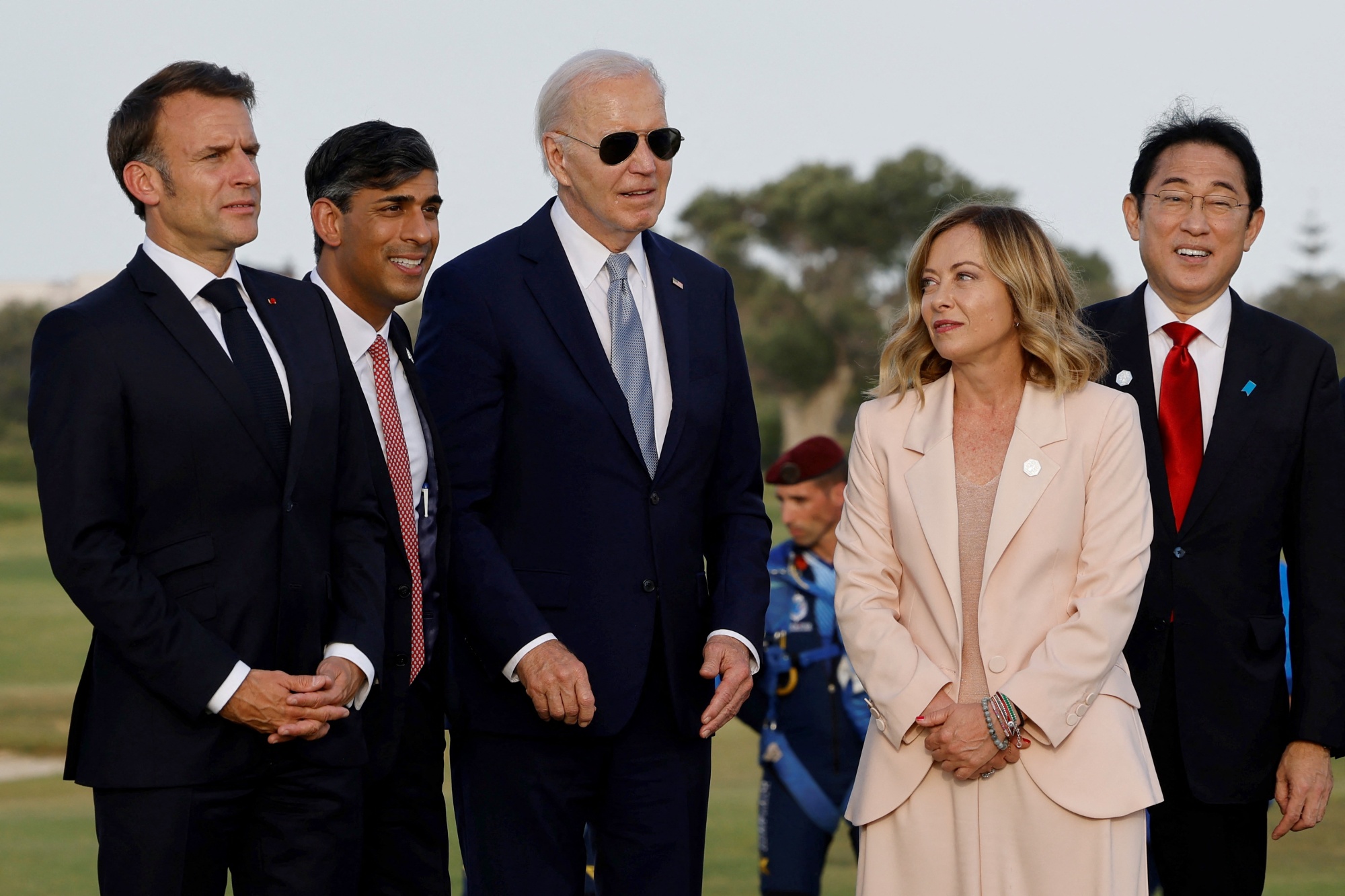彭博观点美联储如何帮助证明碳税的必要性埃隆·马斯克度过了最美好的父亲节塔尔萨种族大屠杀受害者等待正义已久猜猜谁为基于信仰的学校买单?是的,谈论一个虚构的鸭子可能对地缘政治峰会来说有点太直白了,考虑到有多少真实的存在:“6只跛脚鸭和乔治亚·梅洛尼:见G-7 2024届班级,”Politico的残酷标题。目前,世界正处于选举困境中,各国元首之间的不安定局势令人不安。不稳定因素在空气中弥漫,变动率很高。气氛不对劲,而且感觉也不对。相反,它们是极右的。这张英国财政大臣里希·苏纳克与梅洛尼尴尬地咯咯笑的照片——最近欧洲议会选举的大赢家——说明了这一点: