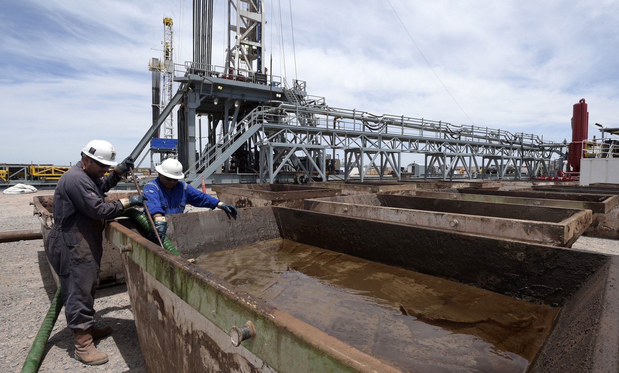 技术人员在内乌肯省洛马坎帕纳的瓦卡穆埃尔塔页岩油储层旁回收泥浆钻井液。