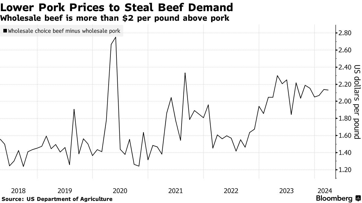 价格更便宜的猪肉将有所帮助。批发牛肉目前比猪肉贵约每磅2美元,为寻找便宜货物的消费者提供了一个简单的选择。