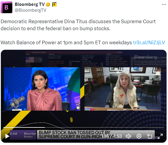 今天在彭博电视台的 权力平衡 早间版节目中,主持人乔·马修和凯莉·莱因兹采访了民主党众议员迪娜·提图斯,谈论最高法院决定结束对颠簸枪托的联邦禁令。