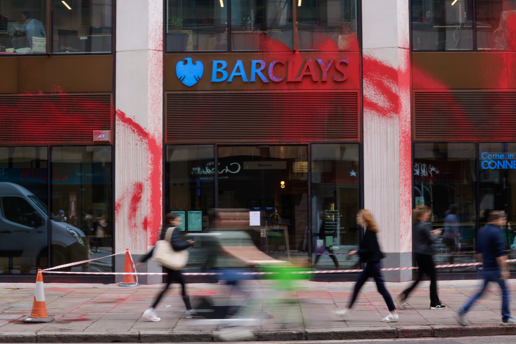 巴克莱银行分行被伦敦市的抗议者盯上,时间是6月10日。摄影师:Jason Alden/Bloomberg该银行的分行已经成为目标。英格兰和苏格兰的15多家巴克莱分行被涂上红漆,窗户被砸,这是巴勒斯坦行动和新成立的气候变化组织“关闭体系”联合抗议的一部分。预计未来几天将在各地的巴克莱分行外发生更多抗议活动。