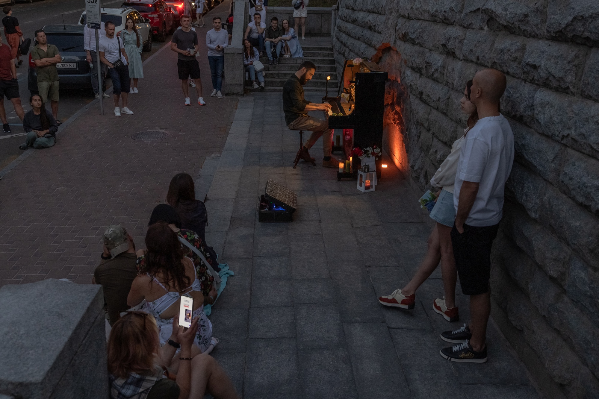 基辅停电期间,一名街头音乐家弹奏钢琴。