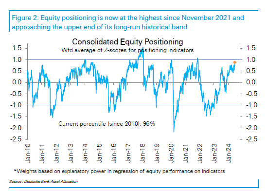 股票权益定位已经攀升至自2021年11月以来的最高水平,德意志银行AG编制的数据显示,当时纳斯达克100指数达到峰值。