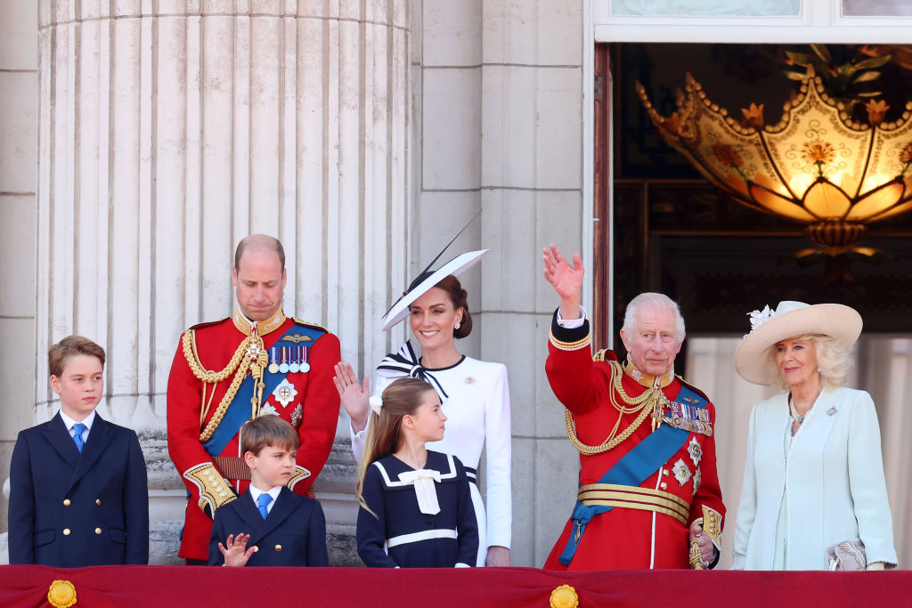 在象征团结的展示中,查尔斯、卡米拉王后、威廉、凯特和他们的孩子们与其他王室成员一起出现在白金汉宫的阳台上,结束了国王生日游行。这个家庭向聚集的人群挥手,观看了军用飞机的飞越,为标志着君主正式生日的仪式画上了句号。