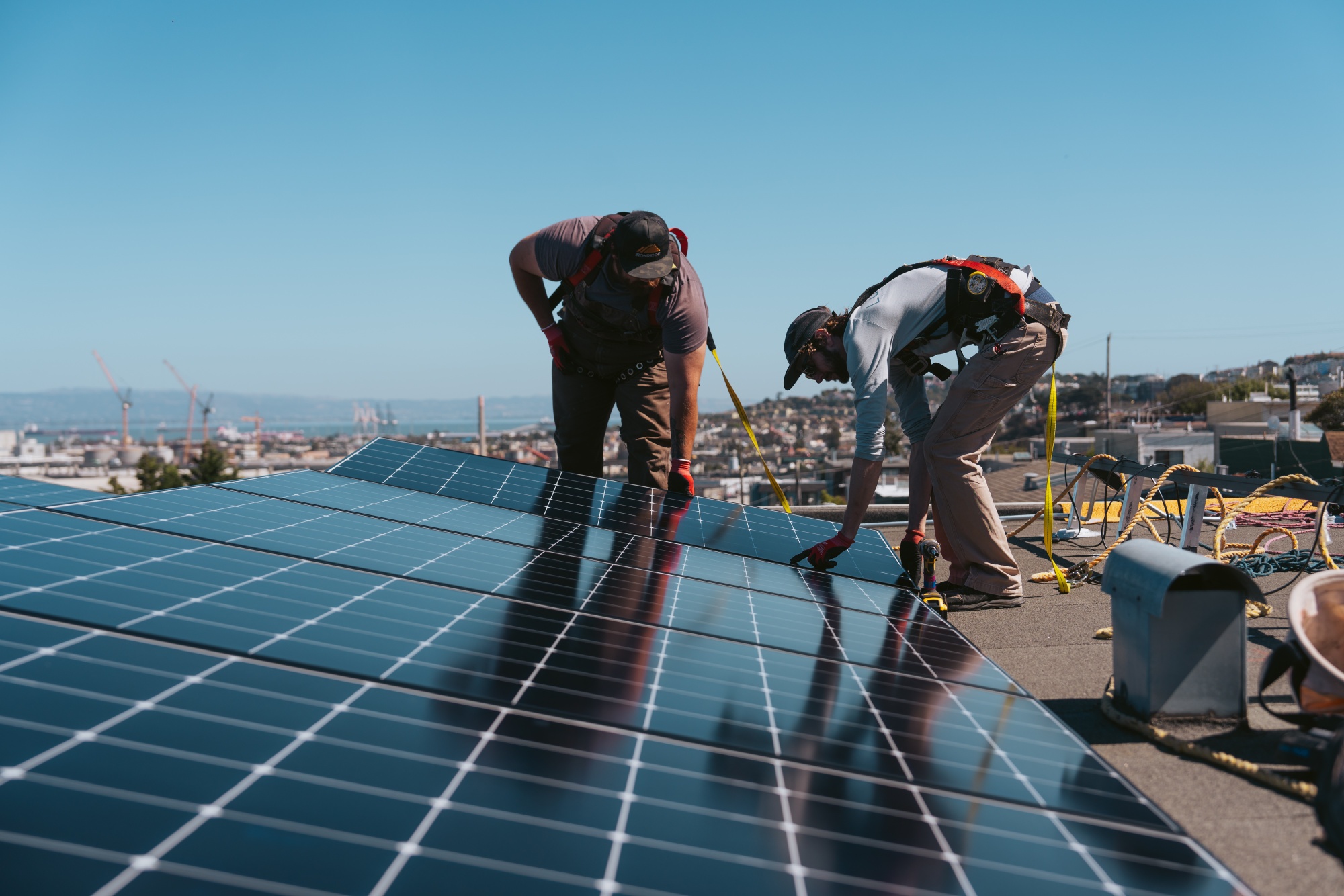 工人们在2023年在旧金山安装太阳能电池板。有很多联邦资金可以帮助支付绿色项目,但“补助金缺口”可能会使一些城市落后。