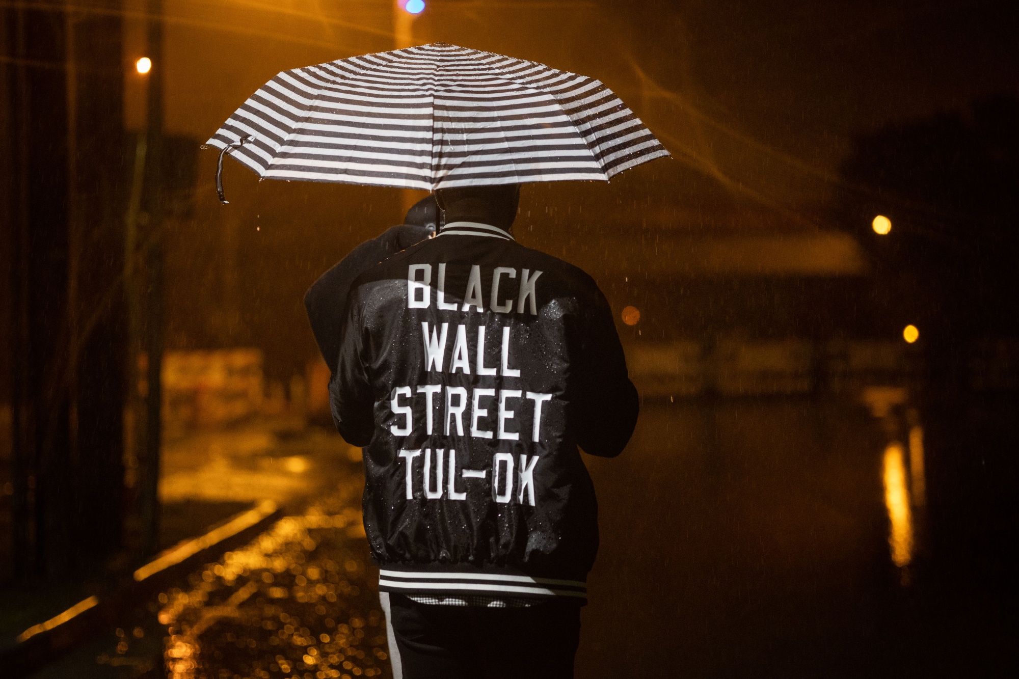 一名男子在俄克拉荷马州塔尔萨的格林伍德区举行烛光守夜时穿着黑人华尔街夹克。摄影师:Christian Monterrosa/Bloomberg但俄克拉荷马州法官选择关注现在。