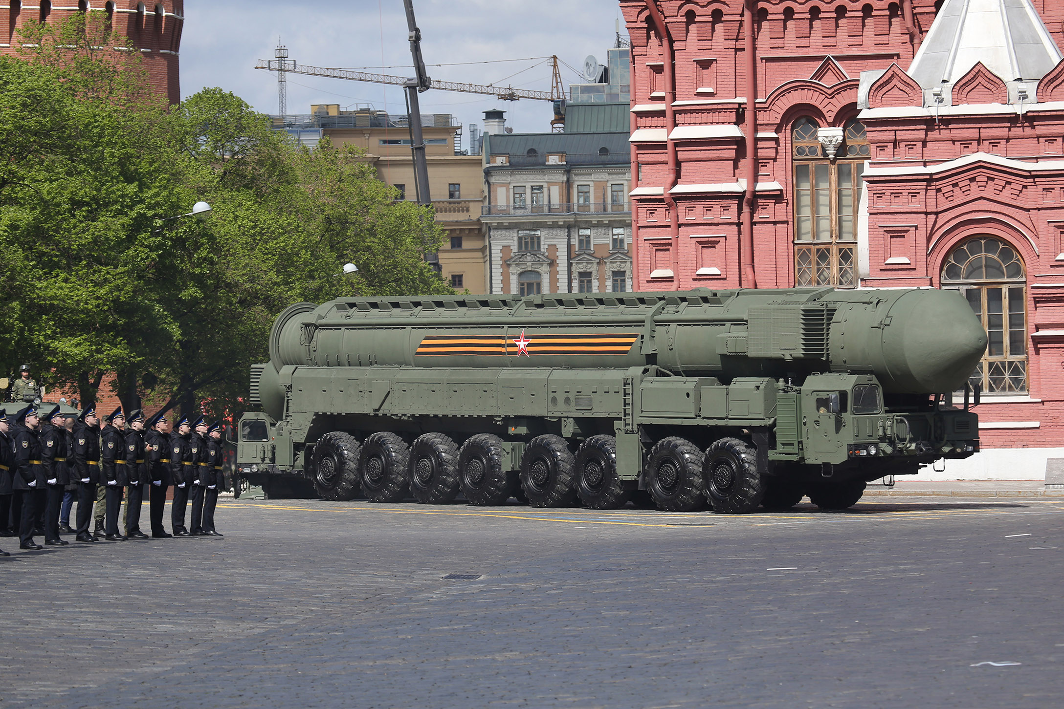 俄罗斯RS-24“亚尔斯”核导弹系统在红场举行的阅兵主役排练期间抵达,时间为5月5日。
