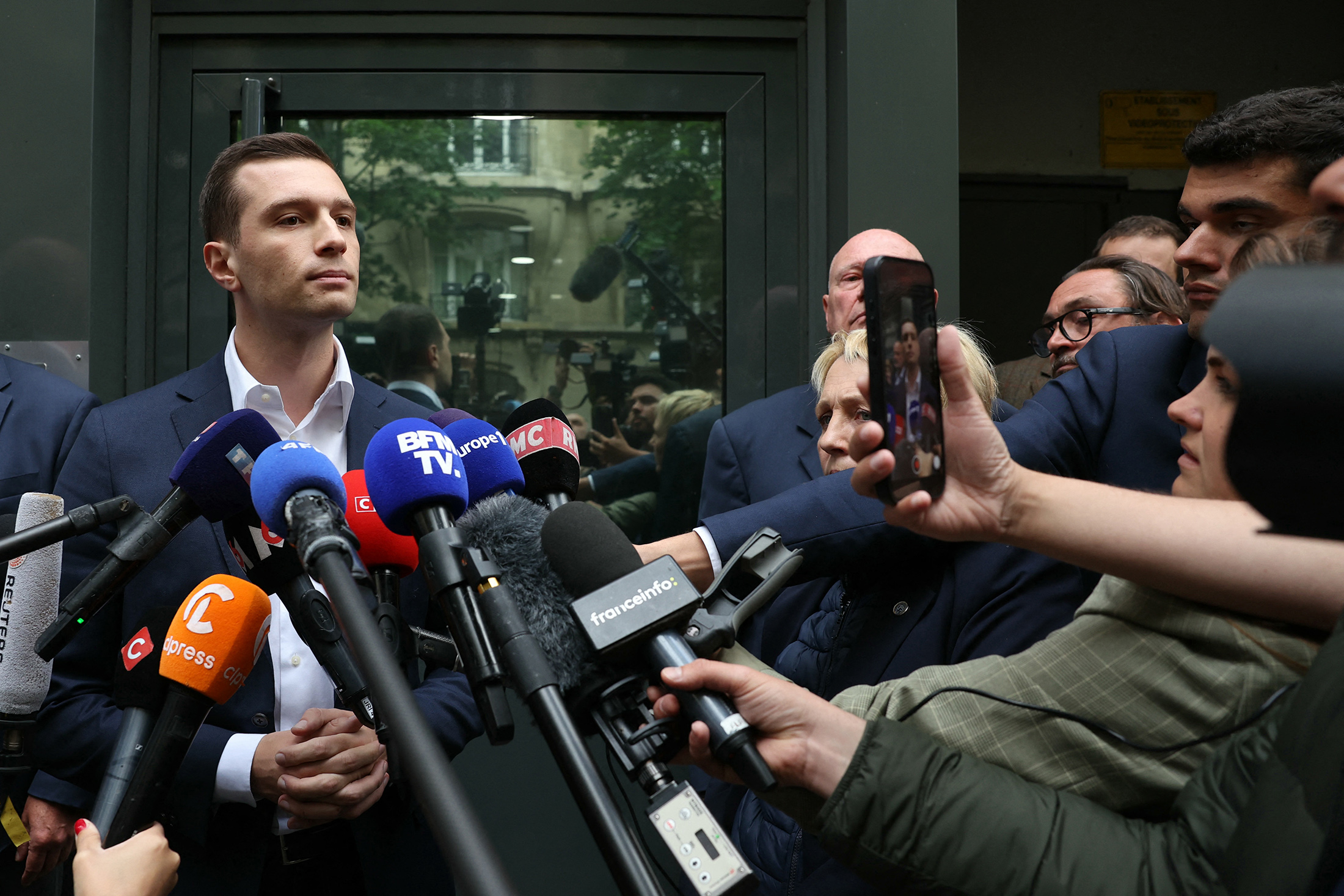 乔丹·巴尔德拉在6月10日在巴黎国民集会党总部外向媒体代表发表讲话。摄影师:阿兰·乔卡尔/法新社/盖蒂图片社根据民调公司的预测,国民集会已经在成为下议院最大党的道路上,这一前景引起了投资者、法国的国际伙伴以及法国部分公众的警惕。