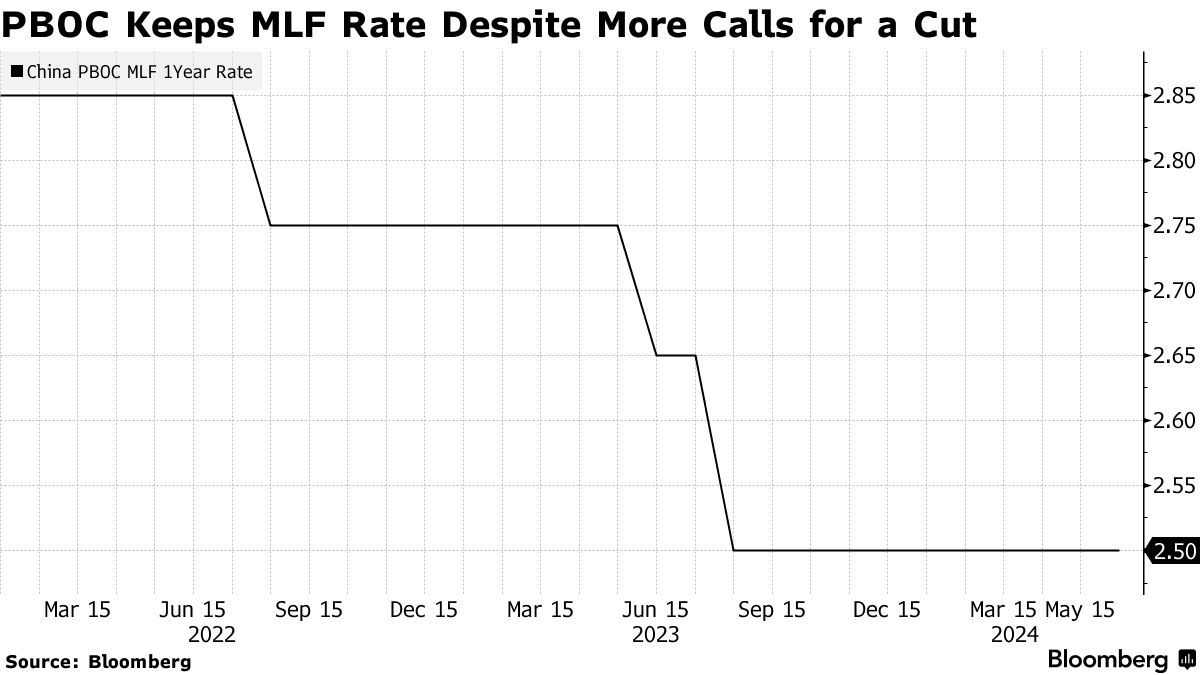 中国人民银行周一将一年期政策性贷款利率,即所谓的中期借贷便利(MLF)利率保持在2.5%不变,与彭博社调查中的预测一致。为避免过度流动性,央行从银行系统中撤回了净55亿元人民币(76亿美元)。