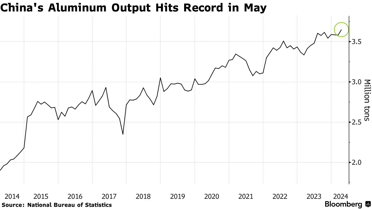 根据周一统计局的数据,铝产量同比激增7.2%至365万吨,尽管日产量从四月份较短的月份有所下滑。