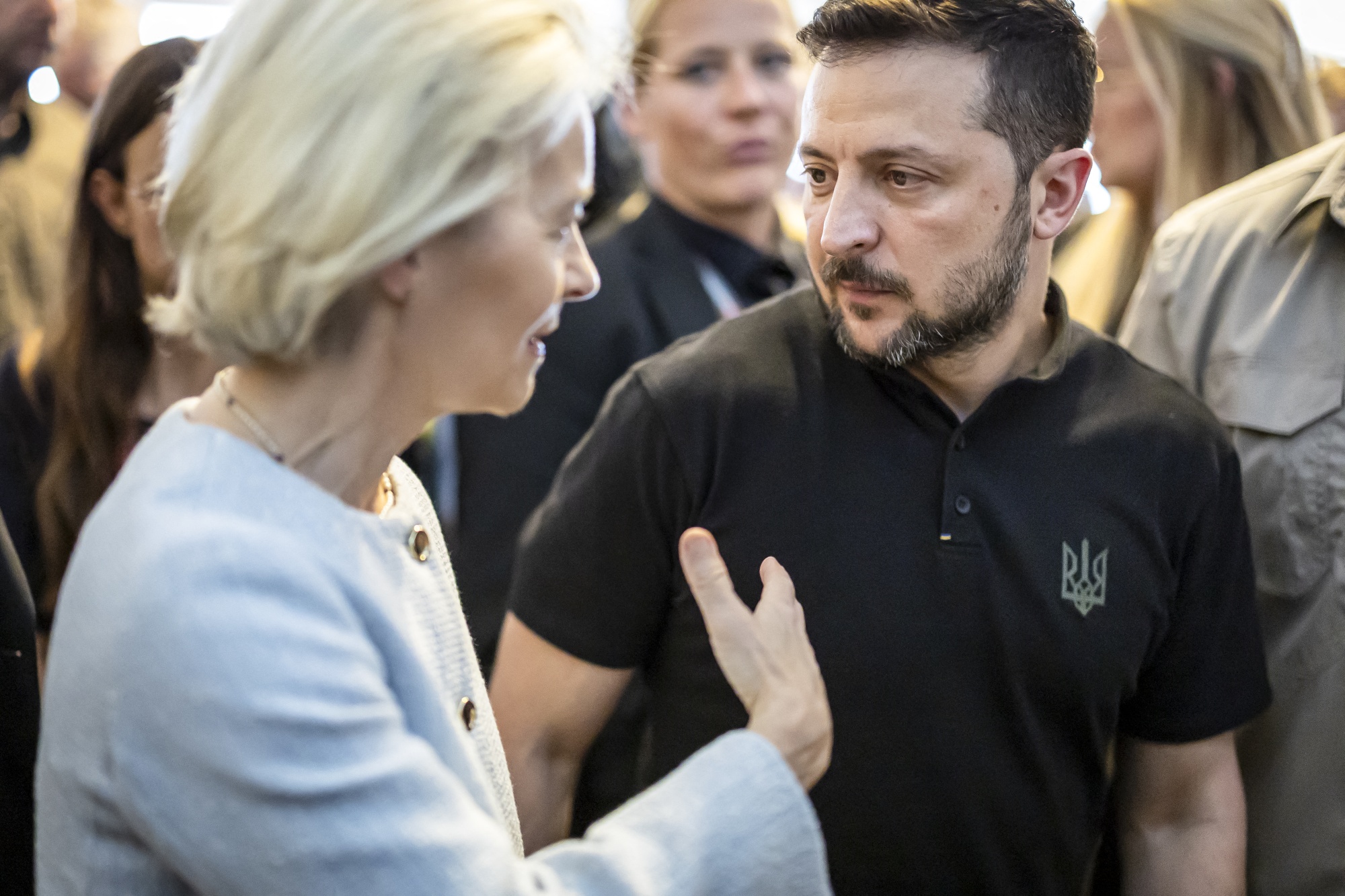 弗拉基米尔·泽连斯基与乌苏拉·冯·德莱恩在瑞士卢塞恩附近举行的乌克兰和平峰会上,时间是6月16日。
