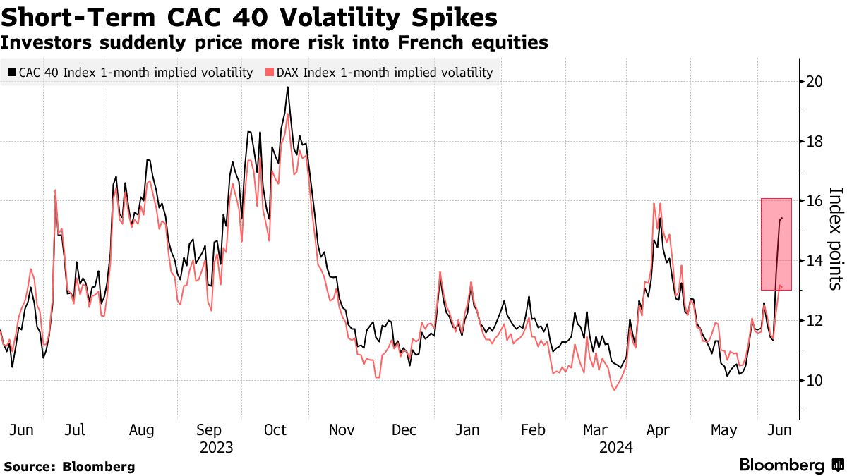 “鉴于当前政治困境不寻常且选举前的高风险,我们认为没有理由急于买入低点,”巴克莱银行策略师埃马纽埃尔·考在6月12日的一份策略备忘录中表示。两轮投票分别在6月30日和7月7日举行。