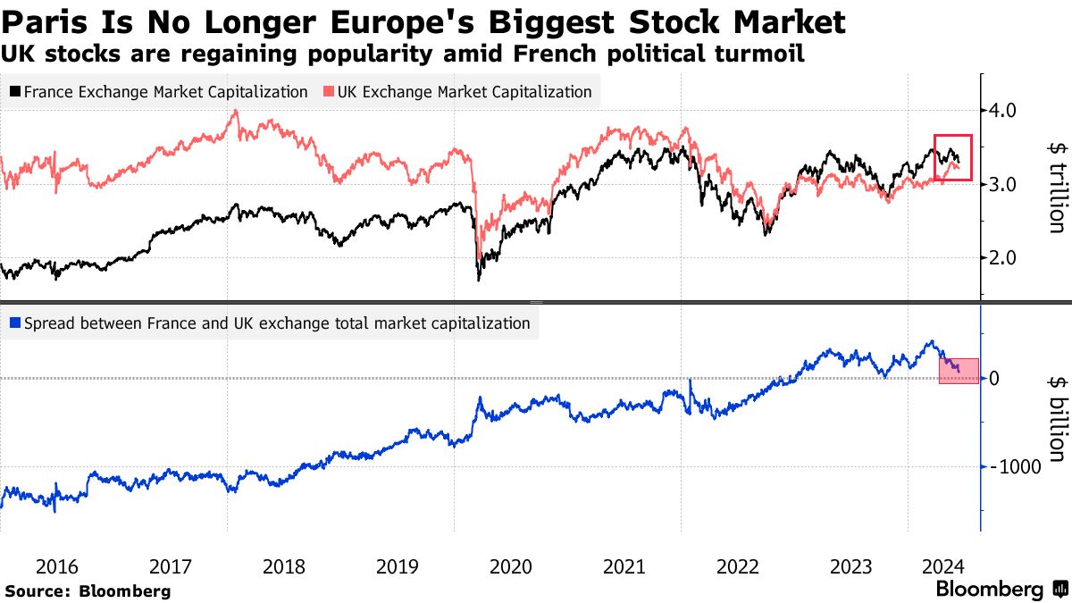 法国的政治动荡导致该国在从英国夺得欧洲最大股票市场的头衔不到两年后失去了这一地位。总统埃马纽埃尔·马克龙宣布举行提前选举的震惊消息引发了一轮抛售,上周法国企业市值蒸发约2580亿美元。法国银行巴黎银行、法国巴黎银行和法国农业信贷银行的股票——这些银行都是政府债券的大持有者——每家都下跌了超过10%。