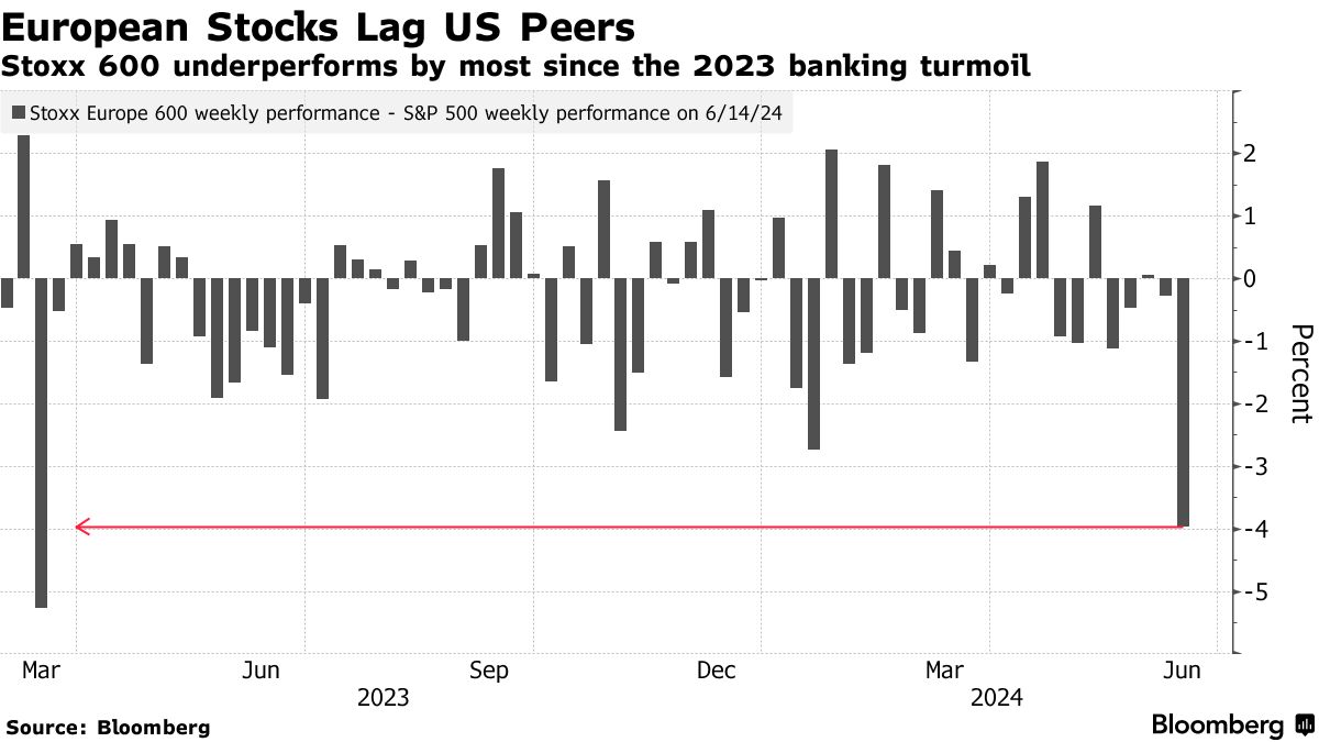 上周的撤退也波及到更广泛的欧洲股市,欧洲斯托克斯600指数遭受了自去年10月以来最糟糕的一周。该指数落后于美国股市的涨势 — 形成了自去年三月银行业动荡以来与标普500指数的最大周度背离。