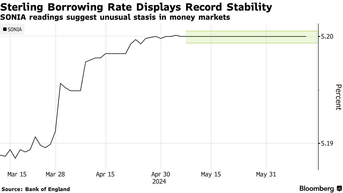 英镑隔夜利率指数平均值,或SONIA,自5月7日以来每天稳定在5.2000% — 或者说28个工作日 — 这是自1997年创建以来从未发生过的事情。之前最长的连续天数仅为四天。