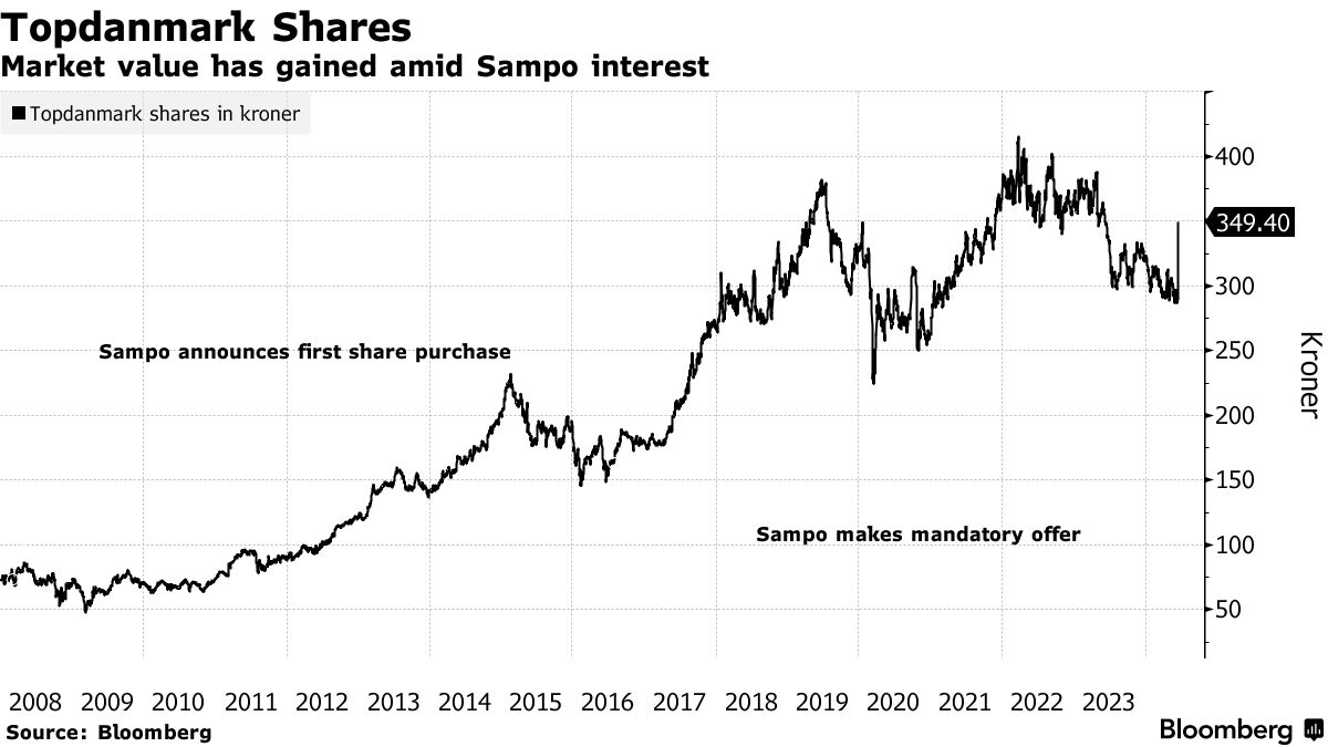 根据Sampo在纳斯达克赫尔辛基的周五收盘价39.29欧元计算,该报价代表Topdanmark每股366.38克朗的价值。Sampo表示已对Topdanmark的某些股东进行了市场调查,并收到了对该报价的积极反馈。