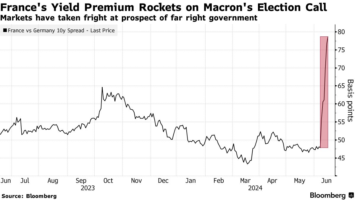 本周初,法国市场显示出稳定的迹象。极右翼国民联盟党主席玛琳·勒庞承诺,如果她赢得即将到来的议会选举,将与总统埃马纽埃尔·马克龙合作。在欧洲议会选举中遭受失败后,总统安排了这些选举。