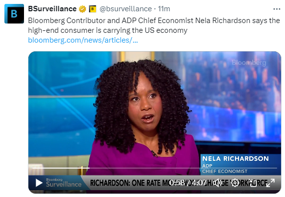 美国经济受到更多有可支配收入的高端消费者以及收入有所增加的较为贫困的美国人的部分支持,这是根据ADP首席经济学家、彭博社撰稿人内拉·理查森的说法。