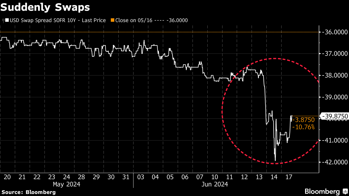 简单来说,掉期利差是给定掉期的固定利率部分与像美国国债这样的政府债券收益率之间的差异。随着法国总统埃马纽埃尔·马克龙决定提前举行选举的消息上周搅动了市场,特别是在政府债券方面,交易员纷纷平仓,帮助大幅压缩了掉期利差。将欧洲风险偏离气氛与较为冷静的CPI数据和随后美国国债的上涨相结合,掉期利差最终收窄了很多。